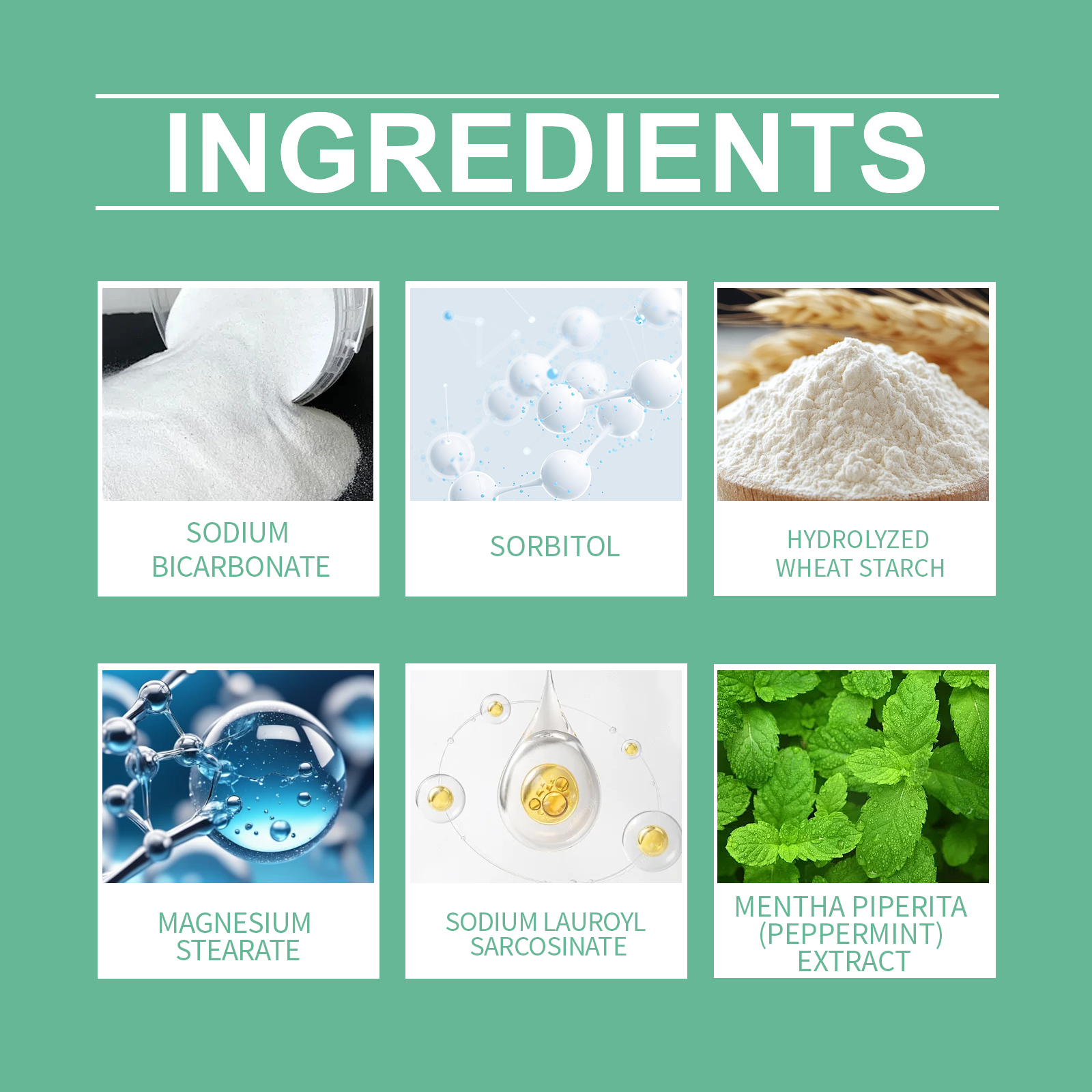 Our dog tooth cleaning powder contains sodium bicarbonate, sorbide (sugar) alcohol, wheat starch. It can strengthen the teeth, improve breathing, and make your dog healthier. Its use is simple: spoon the appropriate amount of this product, then dip a wet toothbrush into it, brush gently for 2-3 minutes, after brushing, rinse your mouth with clean water, being careful not to put it in your dog's food. And can effectively clean and deep clean your dog's teeth, removing tartar and plaque.
